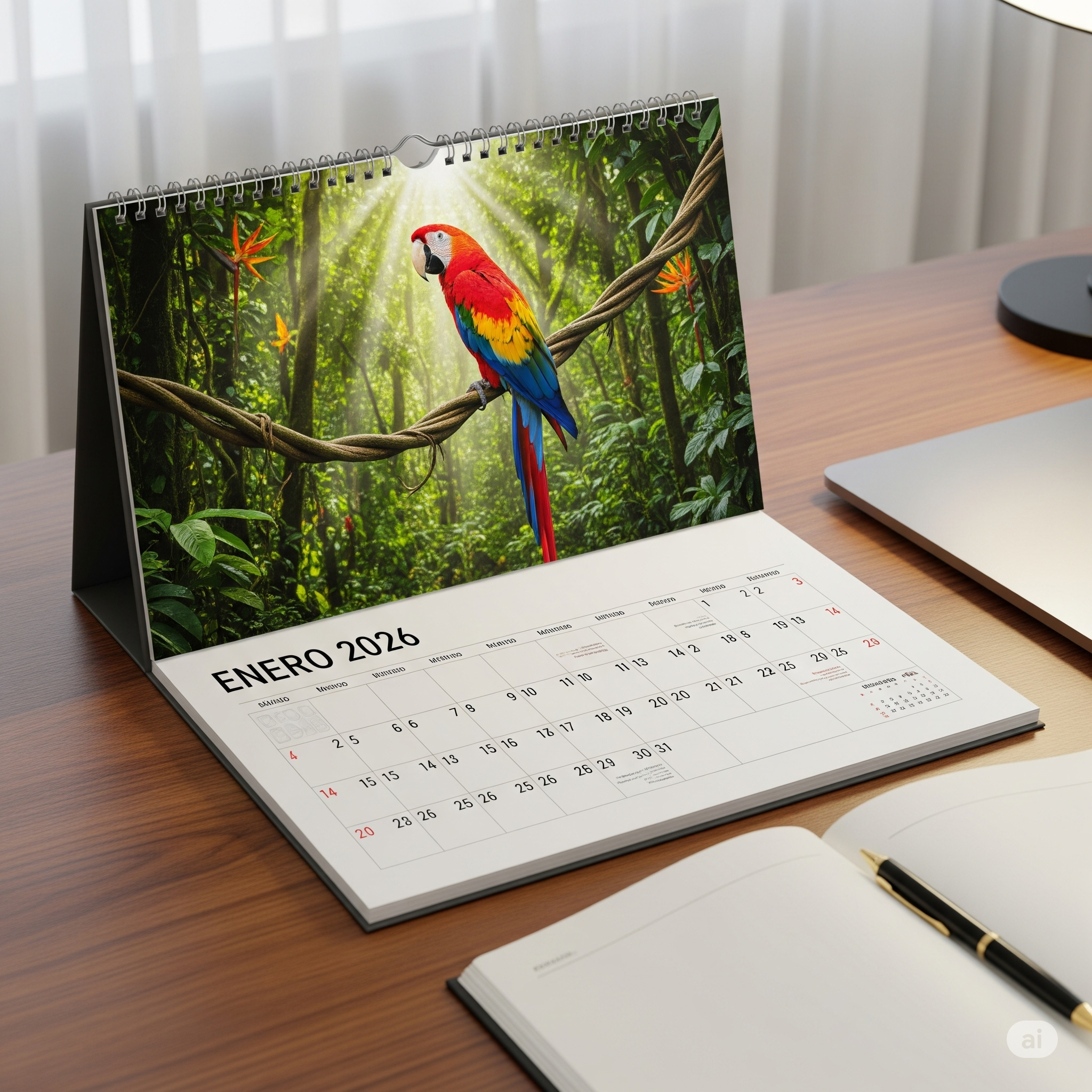 Calendario de escritorio 2026 con impresionantes paisajes colombianos, fabricado con papel 100% reciclado y tintas ecológicas para inspirar tu día a día de forma sostenible.