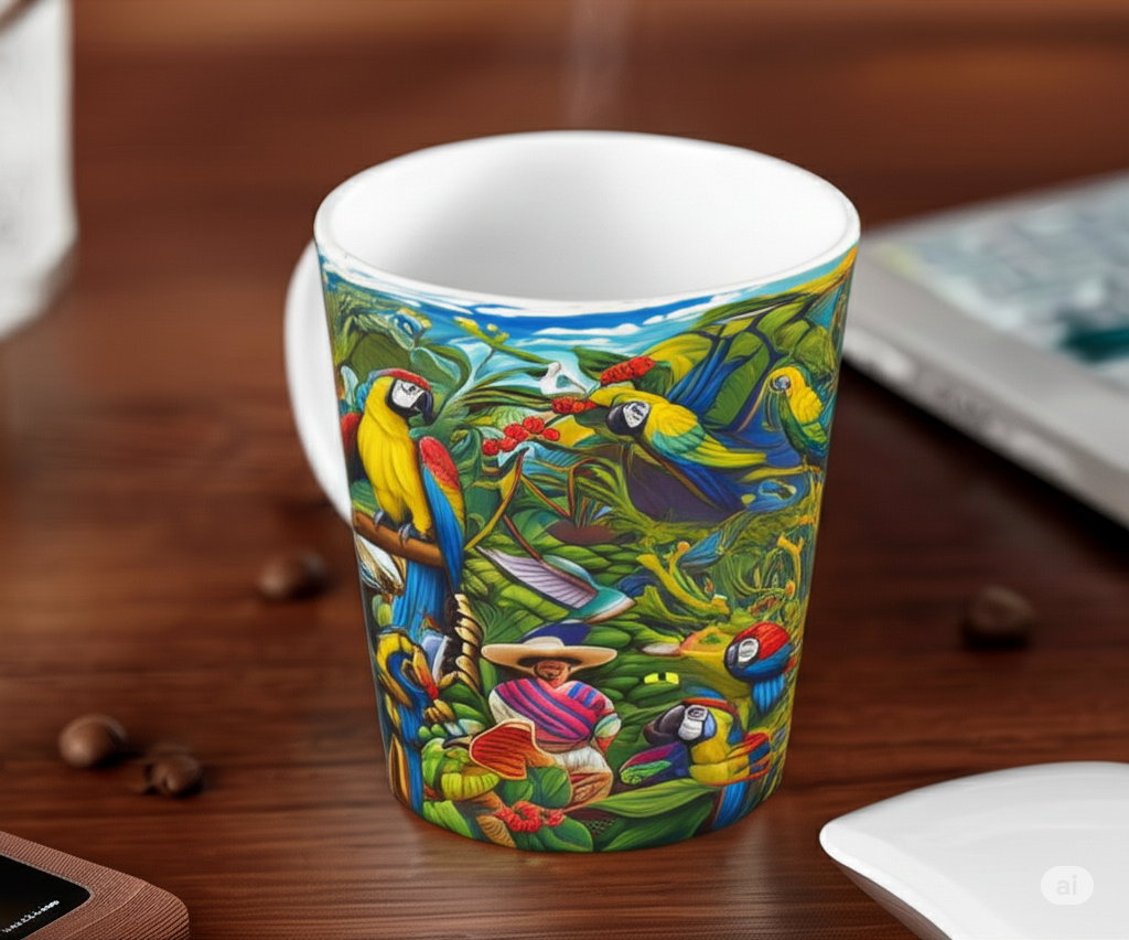 Lleva la esencia de Colombia a tu día con nuestra exclusiva Taza Colombiajero. Con vibrantes guacamayas y cultura cafetera, es el souvenir perfecto para recordar tus viajes o soñar con tu próxima aventura colombiana. ¡Calidad premium, diseño único!